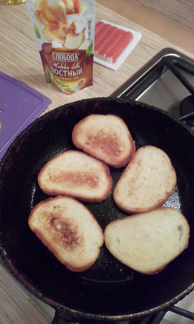 Кусочки батона поджариваем на небольшом количестве подсолнечного масла.