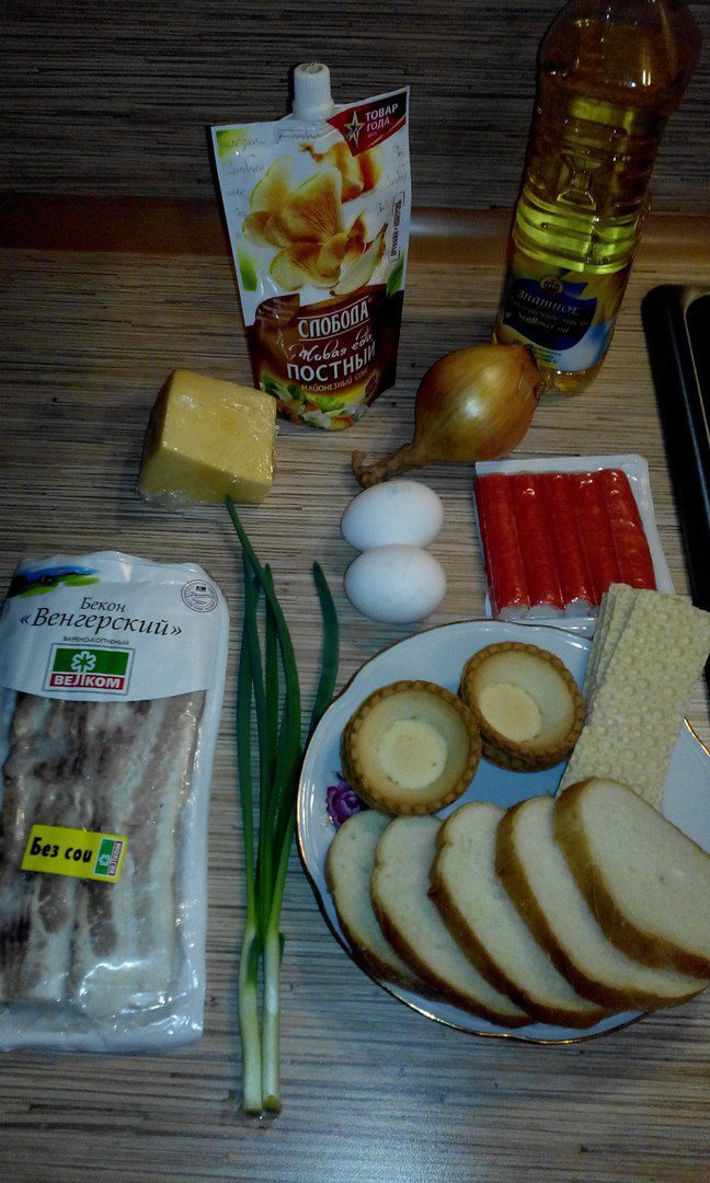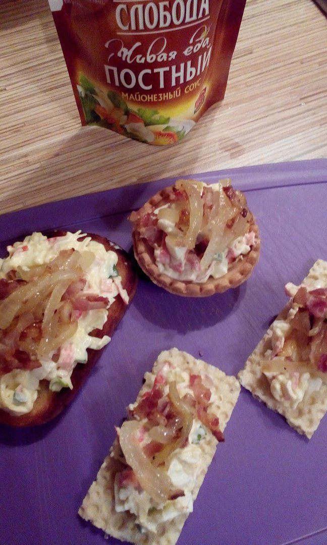Сверху посыпаем жареным луком и беконом. Хрустящий бекон и лук придадут пикантность нашей закуске. Ну вот и все, приятного аппетита!