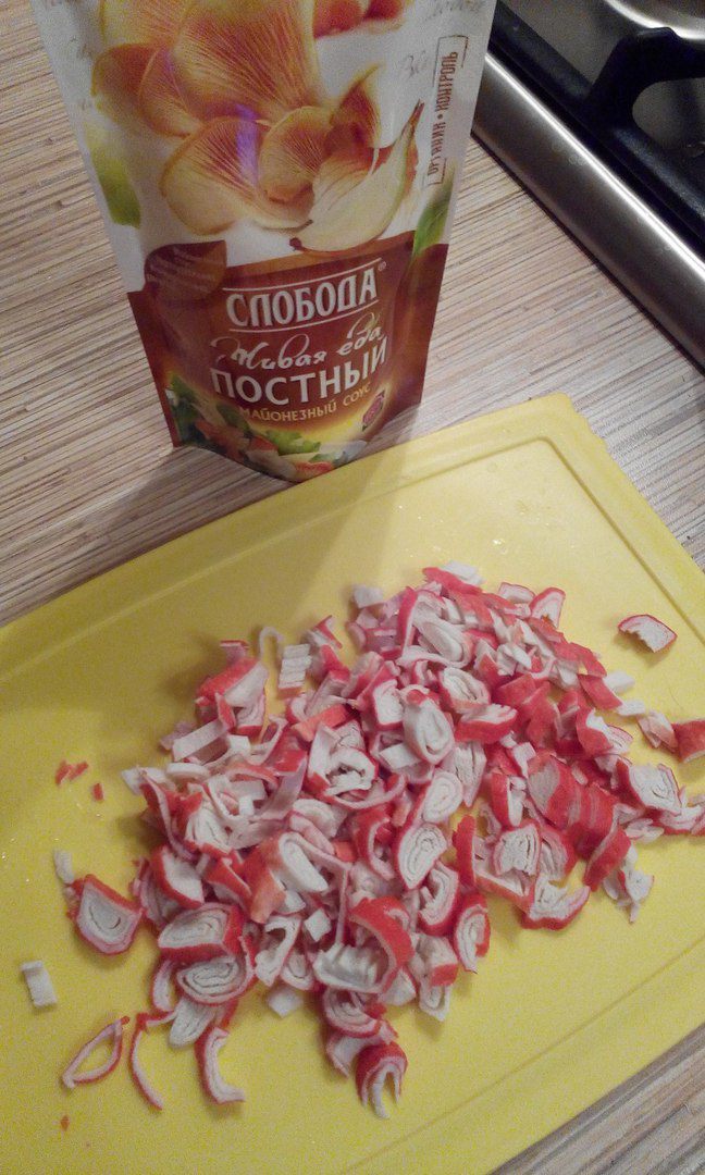 Крабовые палочки нарезаем.