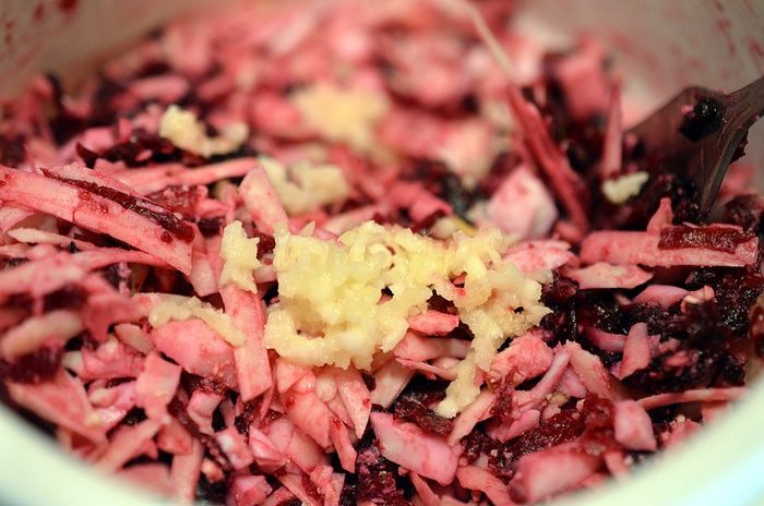 Все перемешать, добавить пропущенный через пресс или натертый чеснок, посолить.