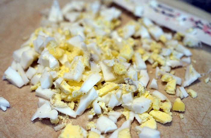 Яйца отварить вкрутую, почистить, нарезать.