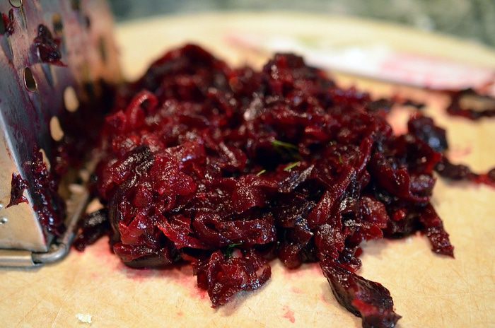 Свеклу отварить или запечь в духовке, почистить, натереть на крупной терке.