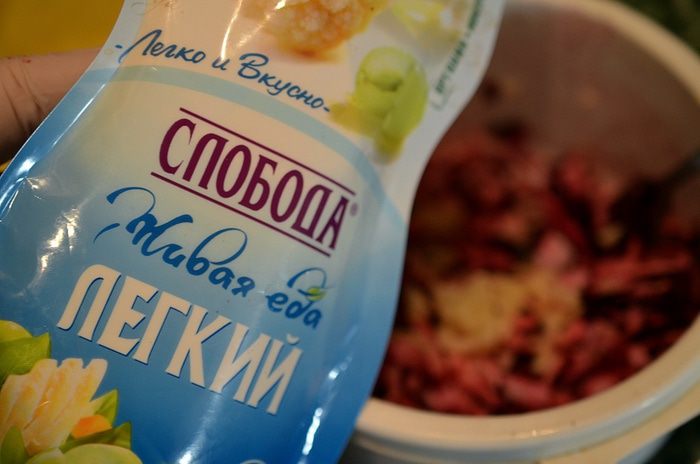 Добавить майонез. Для этого блюда я взяла Легкий майонез ТМ «Слобода». Он не содержит крахмал и ГМО, прошел органик-контроль и сделан из натуральных ингредиентов.