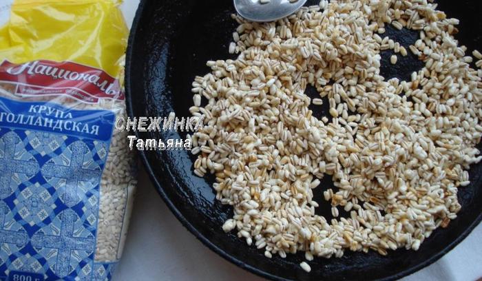 Весь фокус в том, что при прокаливании перловки в раскаленном масле она увеличивается в объеме и становится мягче, похожей на попкорн. Но ведь не проверив, не поверишь! Предлагаю и вам проверить.