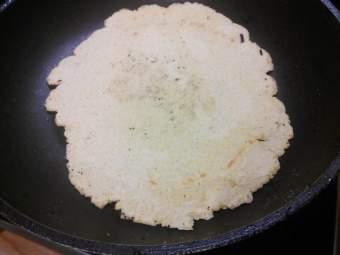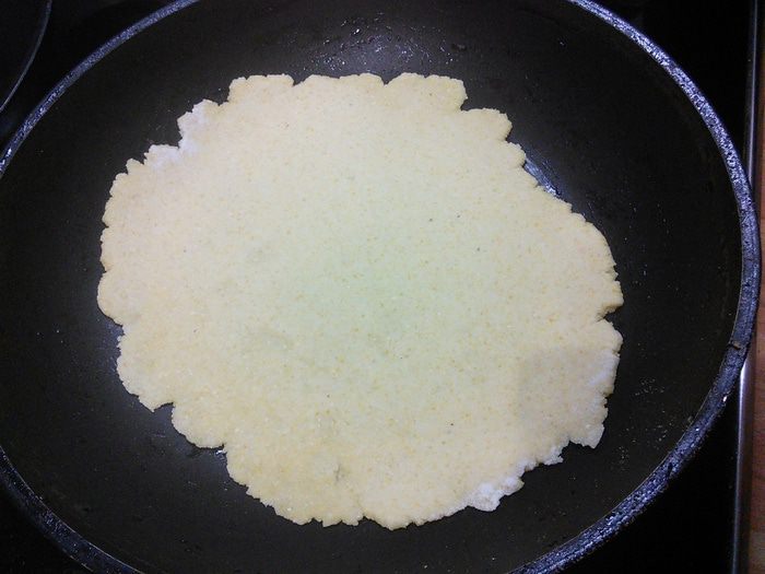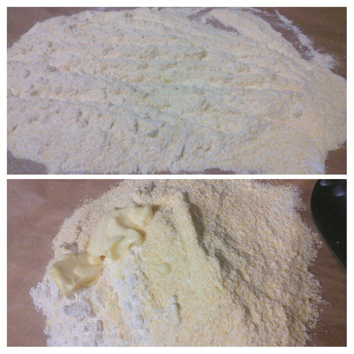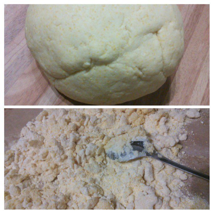 Постепенно добавлять холодную воду, перемешивая ложкой. В начале тесто собирается в комки, но при добавлении всего количества воды, собирается в эластичный колобок. Количество воды может понадобиться чуть больше, главное — тесто должно быть податливым и мягким, не забитым, совершенно не липнуть к рукам. Шарик теста накрыть полотенцем и оставить на 0,5 часа отдохнуть.