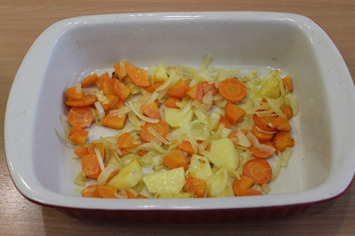 Выложить овощи в форму.