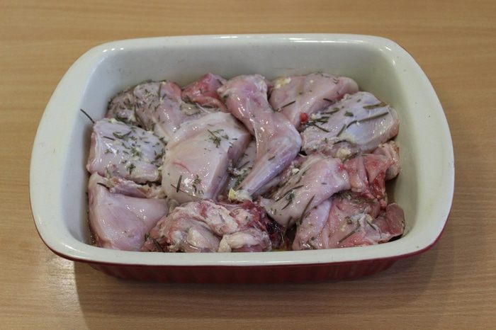 Выложите кролика в емкость, натрите чесноком, добавьте розмарин и тимьян, залейте вином. Поставьте мариноваться в холодильник на 3 часа.