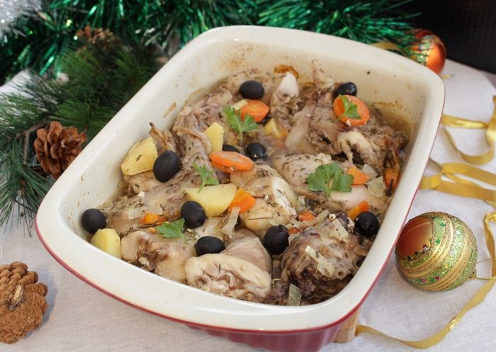 Разогреть духовку до 190°С, форму накрыть фольгой. Запекать 40 минут. Затем увеличить нагрев до 220°С и запекать без фольги еще 20 минут. Добавить маслины.