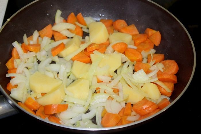 На сковороде разогреть оливковое масло, обжарить крупно нарезанную морковь, лук и картофель около 5 минут.