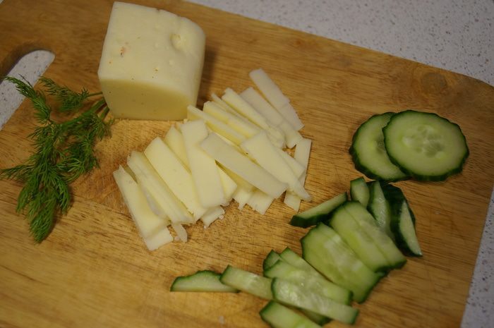 Режем огурцы и сыр соломкой.