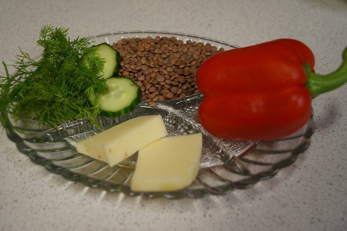 В отдельной салатнице чечевицу, сыр, огурец перемешиваем с майонезом ТМ «Слобода» Легкий. Наполняем им перец и подаем в красивой салатнице, предварительно украсив зеленью, имбирем, пекинской капустой и творожным сыром.