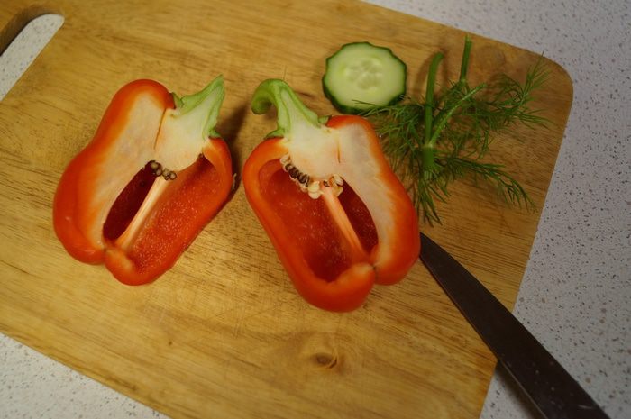 Моем перец, разрезаем пополам и очищаем его от семян.