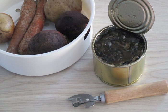 Из банки с консервированной морской капусты слейте жидкость. Картофель, морковь и свеклу нужно предварительно сварить в кожуре и охладить. Рекомендую варку на пару, например, в мультиварке. Для небольших по размеру овощей достаточно 25 минут.