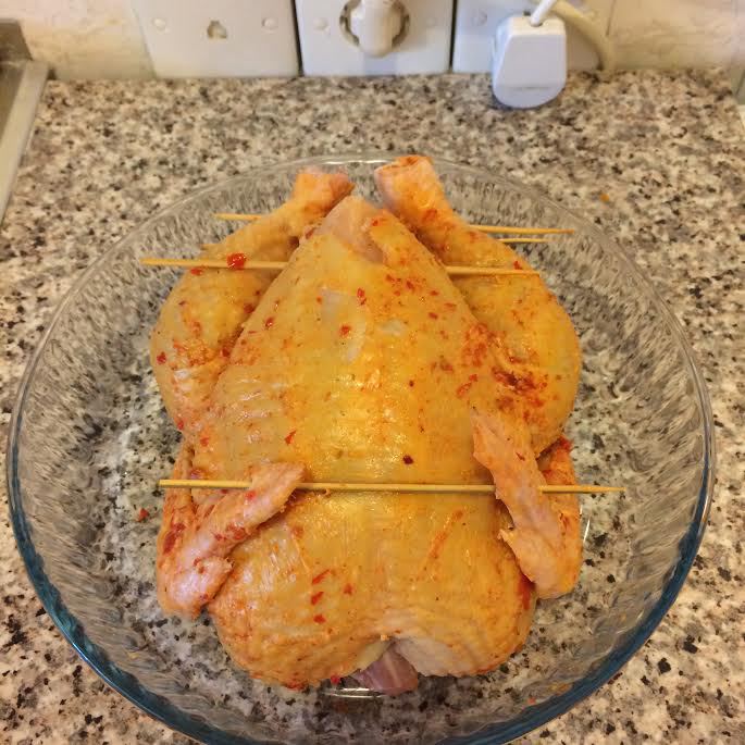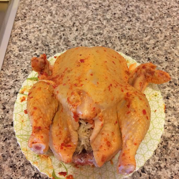 Духовку нагреть до 180°С. Тушку нафаршировать рисом. Сверху хорошо обмазать аджикой с маслом.