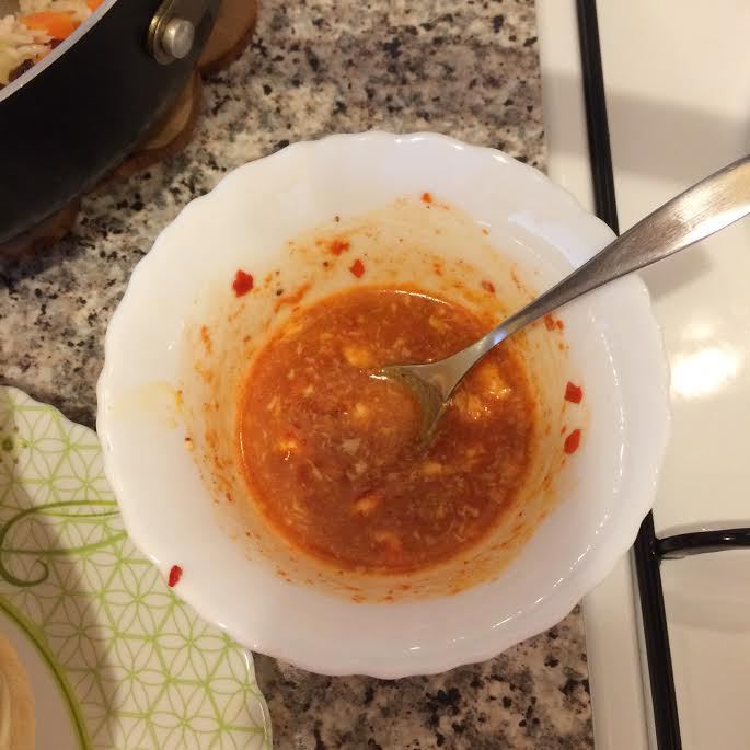 Сливочное масло растопить в микроволновке, добавить аджику и перемешать.