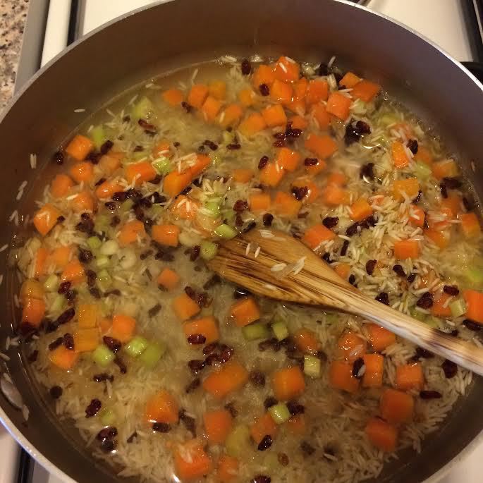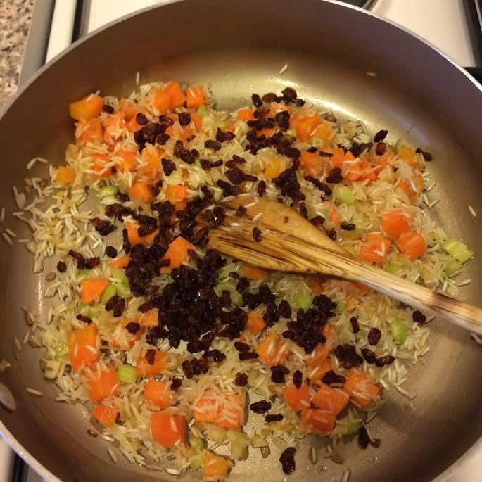 Лук мелко порезать, потушить на растительном масле. Добавить морковь, сельдерей, барбарис, рис, соль, перец и все хорошо перемешать.