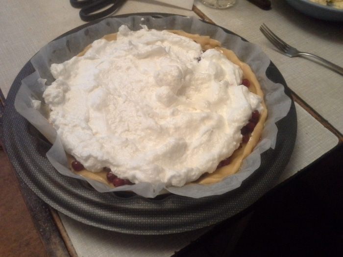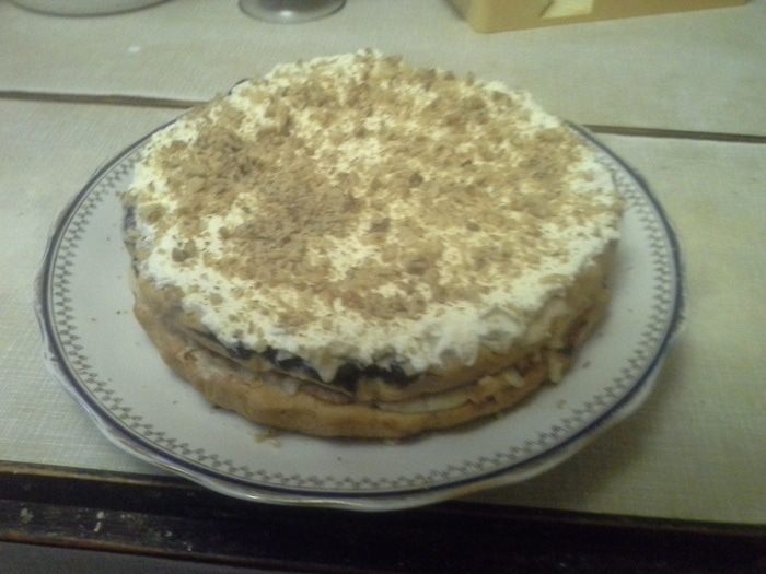 Смазать кремом и положить друг на друга. Украсить взбитыми сливками и орехами. Сливки взбить воздушную крепкую массу, чтобы она не опала.