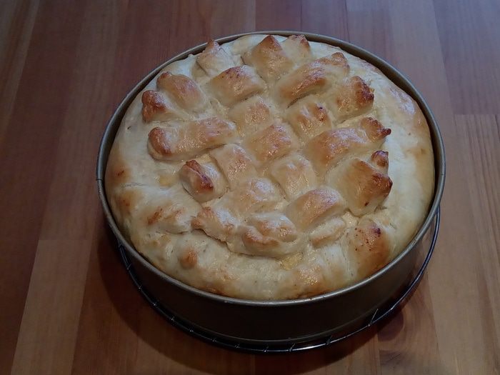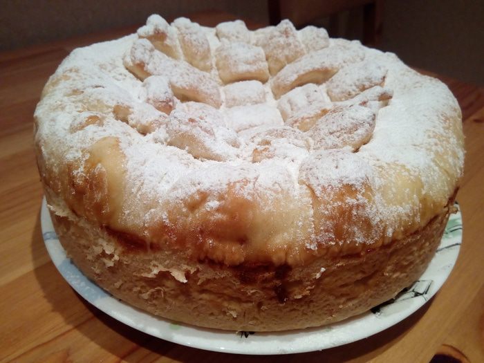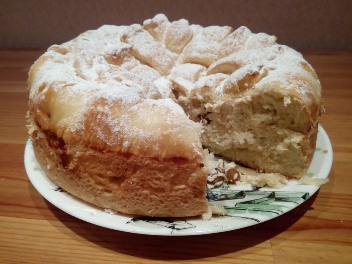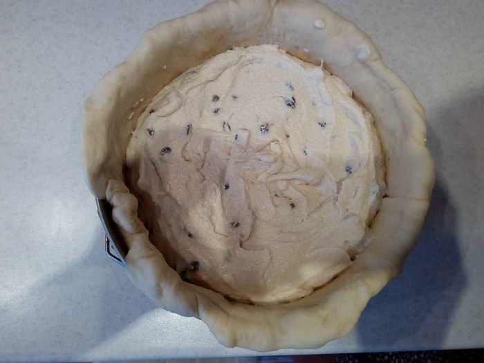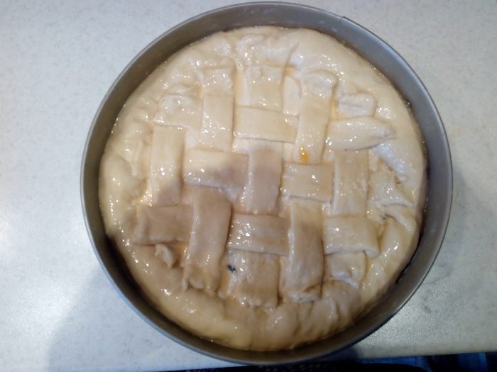Тесто выкладываем в форму для выпечки (я использовала разъемную форму 24 см, но можно использовать, например, и какую-нибудь красивую керамическую форму, в которой сразу можно подать пирог).