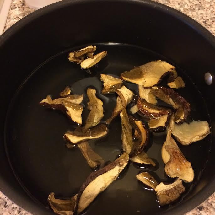 Сухие грибы залить 2 литрами воды и оставить 6 — 8 часов.