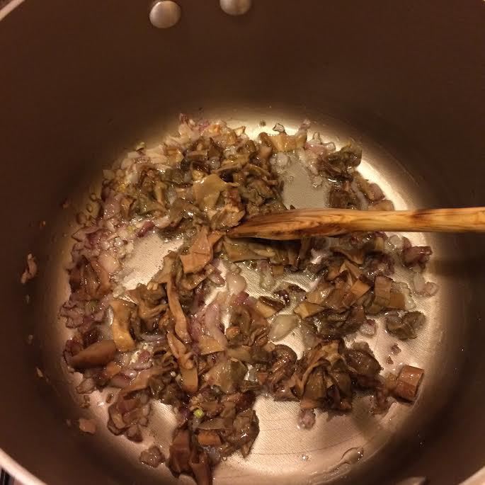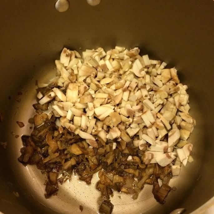 В кастрюле потушить лук, добавить белые грибы, перемешать, накрыть крышкой и тушить 5 минут.