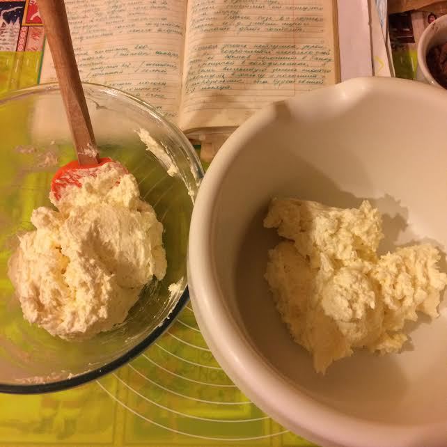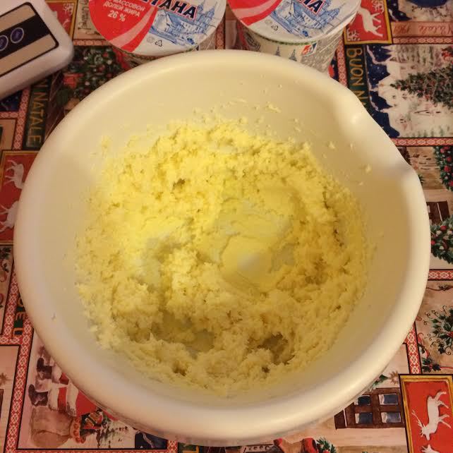 Сметана и масло должны быть одной температуры. Масло взбить с сахаром и ванильным сахаром.