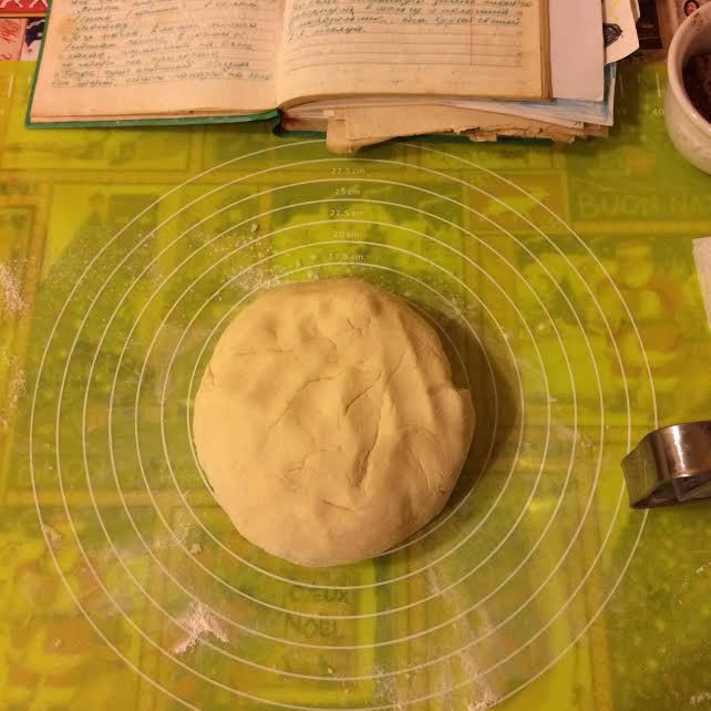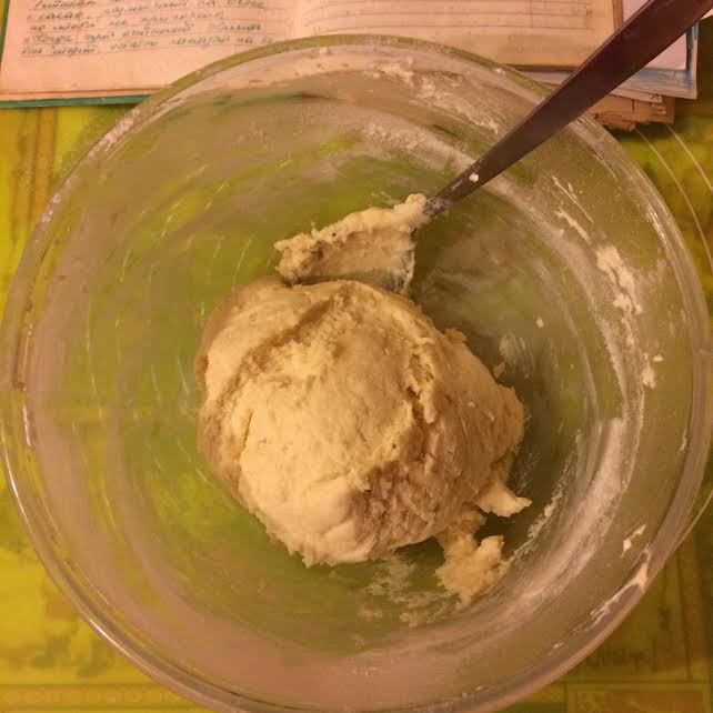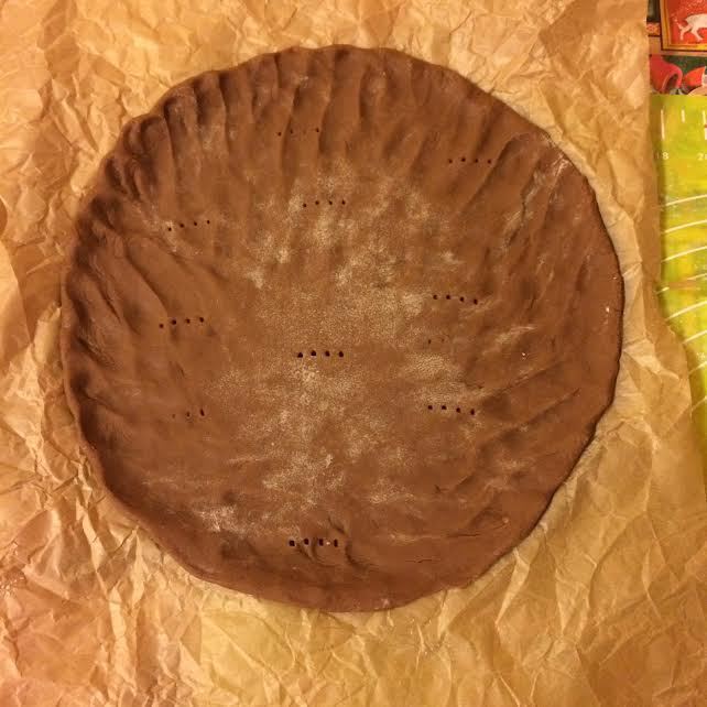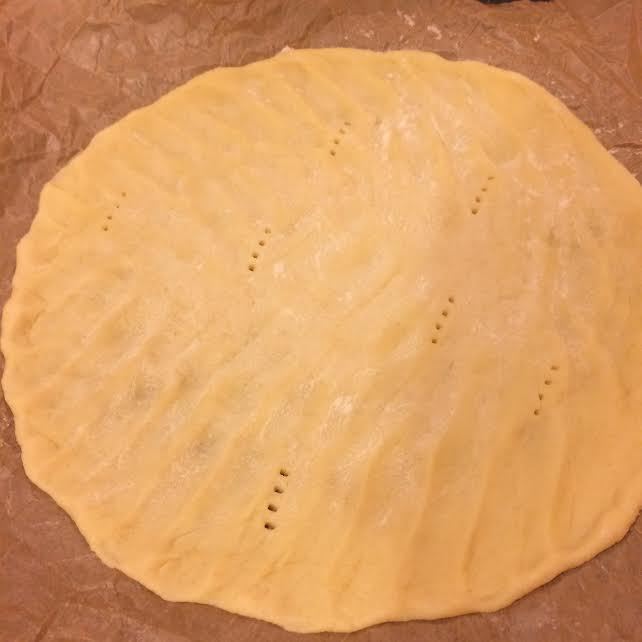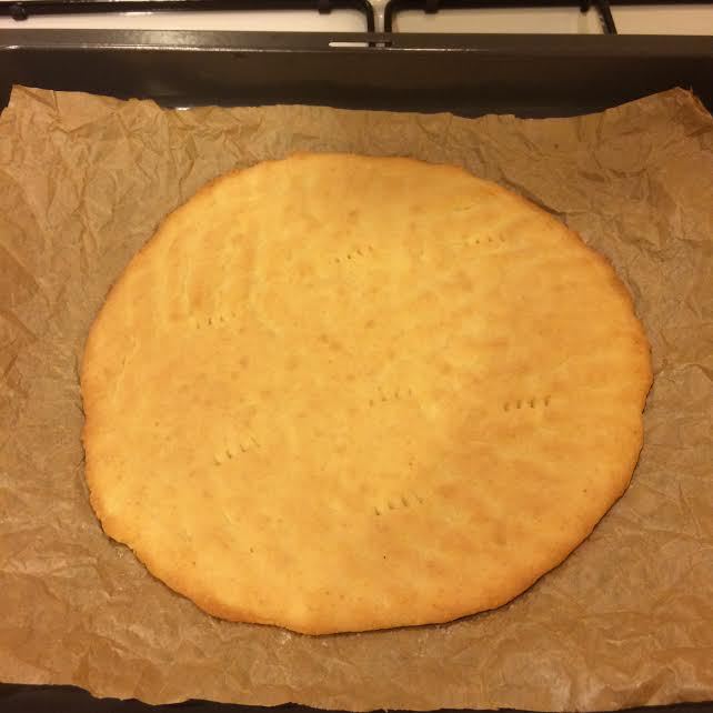 Распределить тесто по форме (Д 26). Я это делаю руками, так как тесто очень нежное, и раскатать его не получится. Наколоть вилкой.