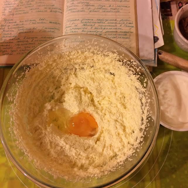 Духовку нагреть до 180°С. Масло взбить с сахаром. Добавить яйцо, ванильный сахар еще раз взбить.