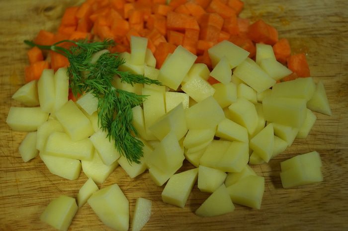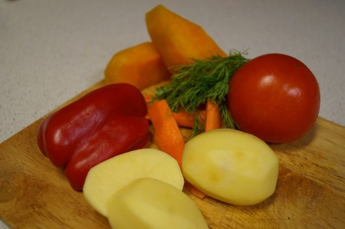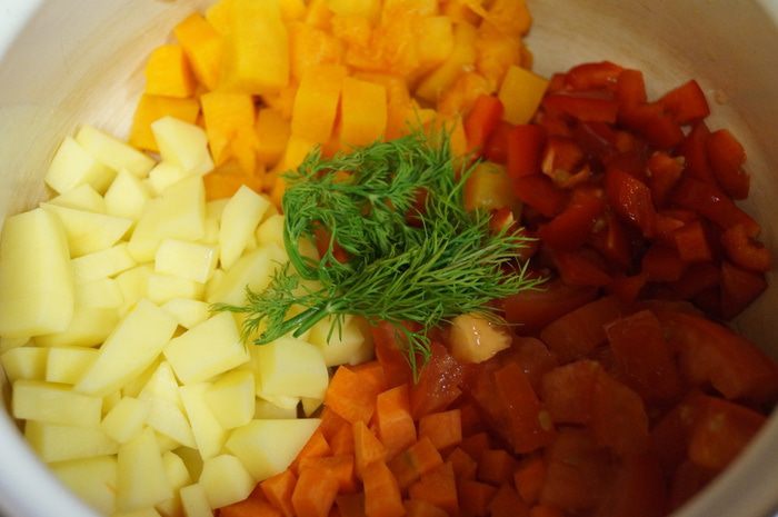 Заливаем кипяченной водой так, чтобы все продукты были погружены в воду. Варим 25 — 30 минут, после готовности измельчаем все с помощью блендера до однородной массы.