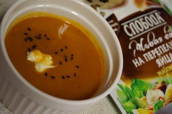 Подать можно с долькой лимона и посыпав суп черным кунжутом. Обязательно при этом добавьте майонез ТМ «Слобода» на перепелиных яйцах!