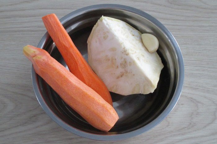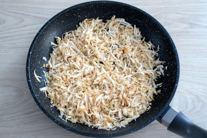 Корневой сельдерей нужно крупно натереть и слегка обжарить на сковороде на среднем огне на растительном масле или просто так по-сухому. Цель в том, чтобы корень сельдерея стал помягче и приобрел более привлекательный вкусовой оттенок, так что хватит 3 — 5 минут.
