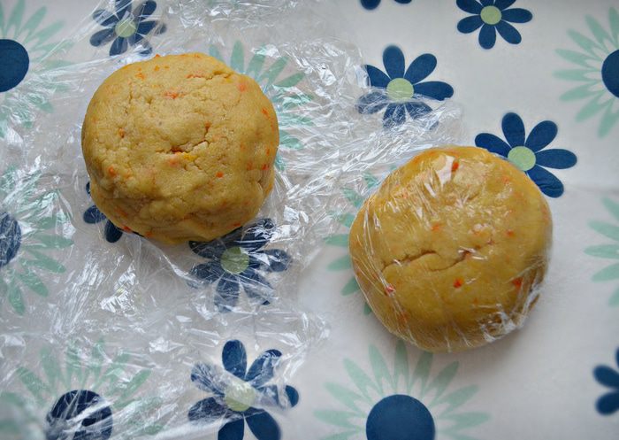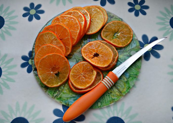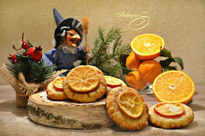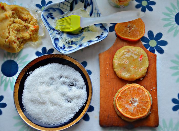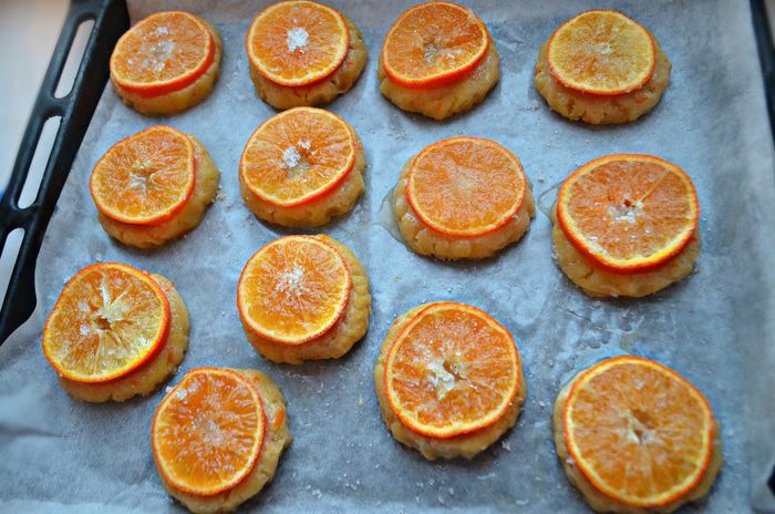 Противень застелите пекарской бумагой и слегка смажьте сливочным маслом. Выложите заготовки на противень, сверху присыпьте сахаром, сверху смажьте белком, выложите кружки мандаринов, слегка прижимая к тесту, и снова присыпьте сахаром. Выпекайте печенье в разогретой духовке до 200°С 20 — 25 мин.
