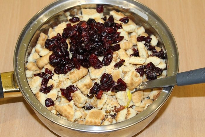 Затем крупно поломанное печенье, клюкву. Перемешайте.