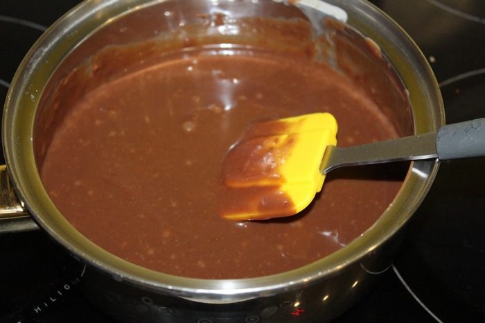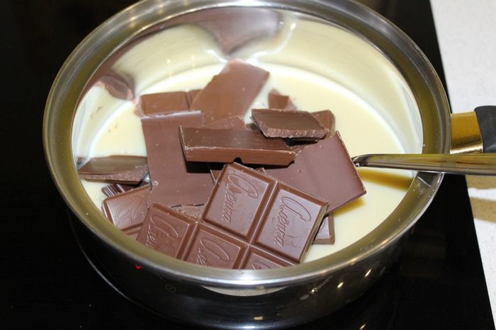 В кастрюле соедините сгущенное молоко и шоколад, поломанный на кусочки. Нагревайте на среднем огне, постоянно помешивая, примерно 5 минут,