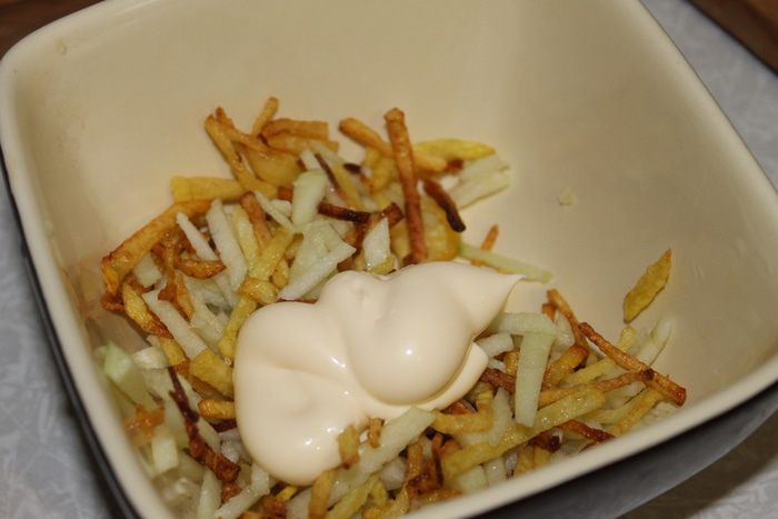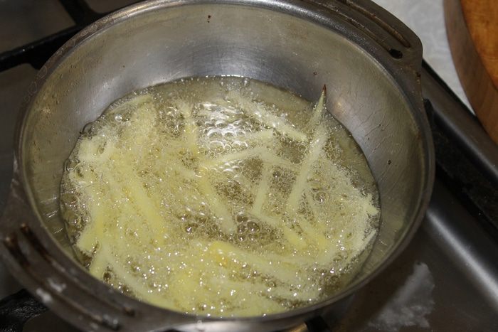 Нагрейте масло для фритюра и обжарьте соломку из картофеля. Обжаренный картофель выкладывайте на салфетку, что бы удалить лишнее масло.