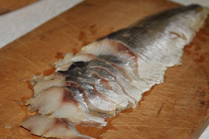 Заранее залейте филе сельди молоком, если у вас слабосоленая сельдь, можно использовать готовое филе не вымачивая в молоке.