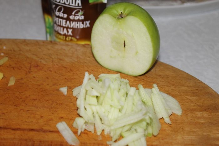 Так же соломкой нарежьте очищенное от кожуры зеленое яблоко.