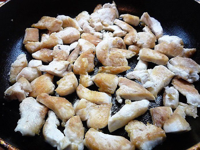 Куриные грудки нарезаем небольшими дольками, обжариваем в течении 5 минут на сковороде с разогретым оливковым маслом. Остужаем и нарезаем соломкой.