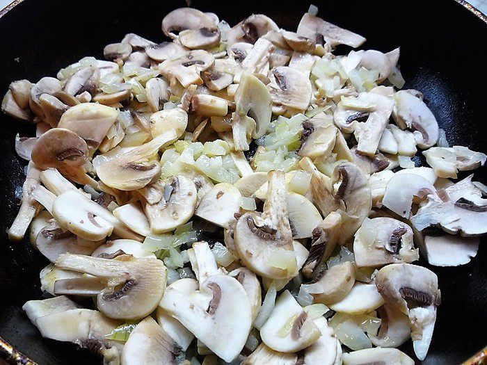 Лук мелко нарезаем, обжариваем до золотистого цвета. Добавляем нарезанные тонкими пластинками грибы, перемешиваем и обжариваем на среднем огне в течении 5 минут.