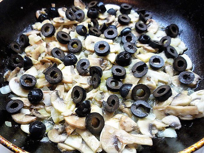 Добавляем нарезанные колечками маслины, еще раз все хорошенько перемешиваем, обжариваем 5 минут и выключаем.