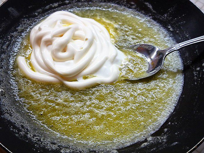Для пряного соуса-заправки в горячей сухой сковороде слегка поджариваем муку в течении 1 минуты, добавляем сливочное масло, перемешиваем и готовим 2 минуты. Добавляем майонез ТМ «Слобода» Сметанный.