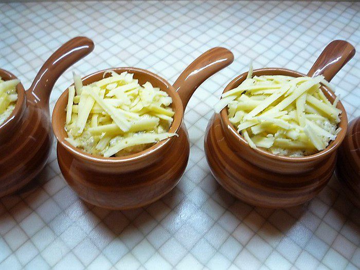 Сверху посыпаем тертым сыром. Ставим кокотницы в холодную духовку, выставляем температуру 180°С и запекаем пока сыр не расплавится и корочка не станет золотистой, примерно 15 — 20 минут.