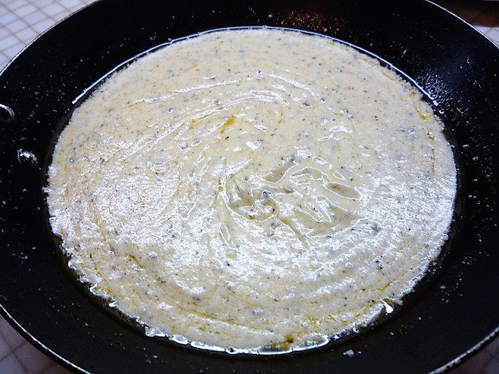 В полученную смесь вливаем куриный бульон, перемешиваем до однородности, чтобы не было комочков.