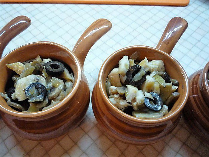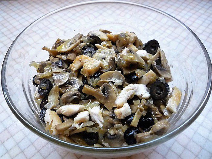 В чашке смешиваем куриное мясо с грибами, луком и маслинами. Сыр натираем на крупной терке.