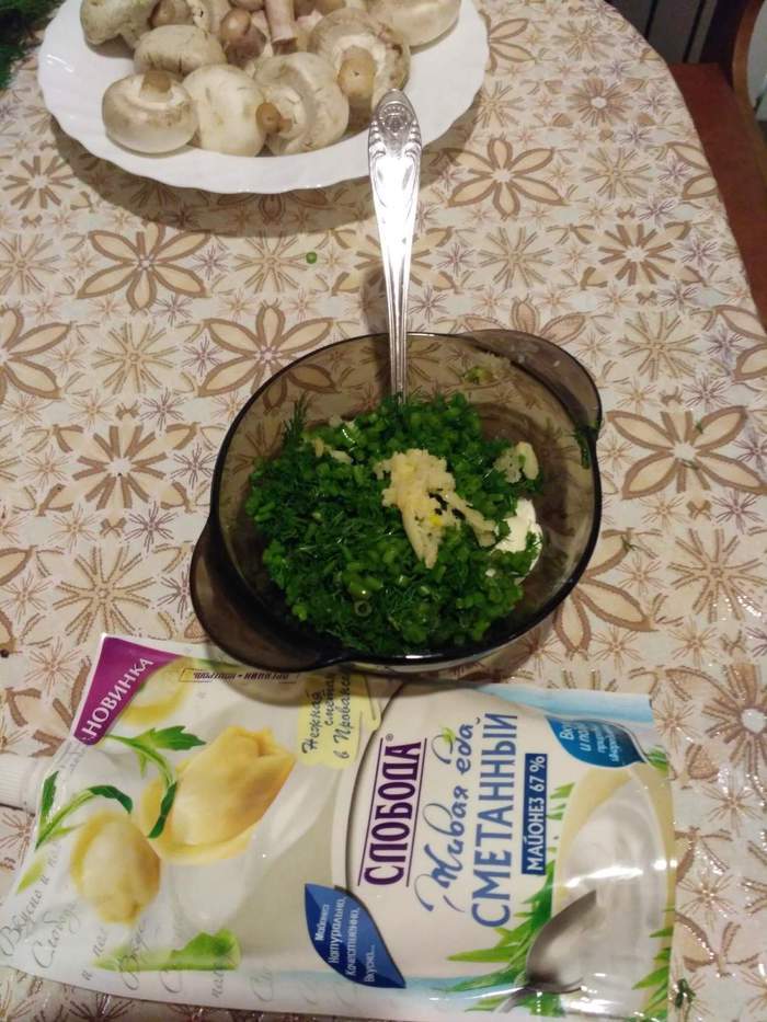 Подготовить смесь из майонеза, чеснока и укропа. Укроп мелко порезать, чеснок пропустить через пресс.