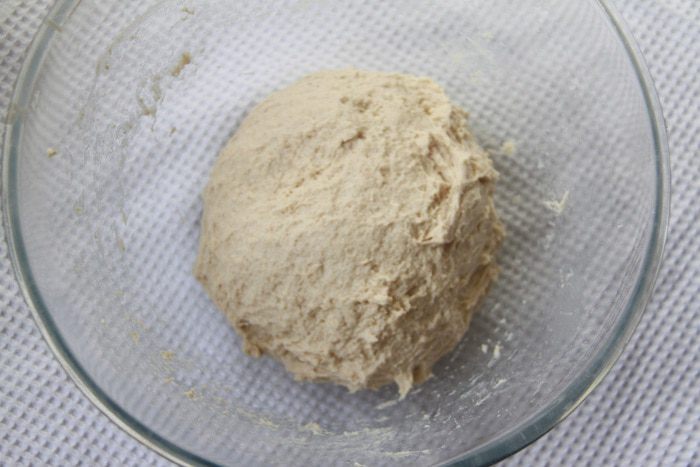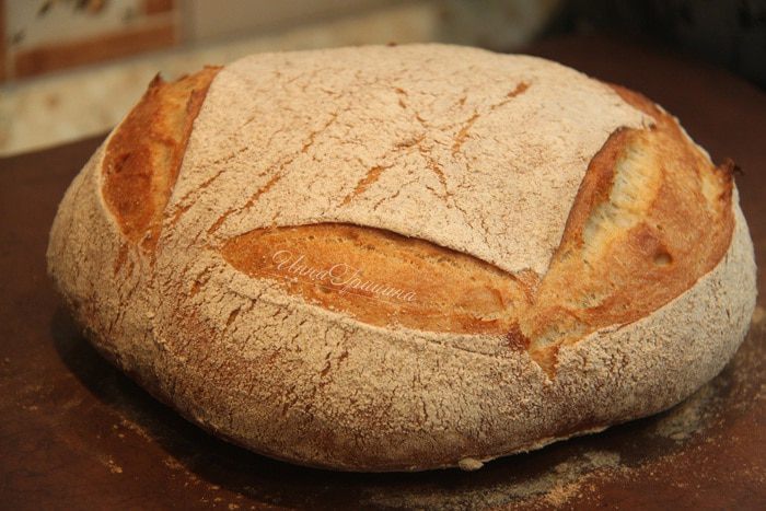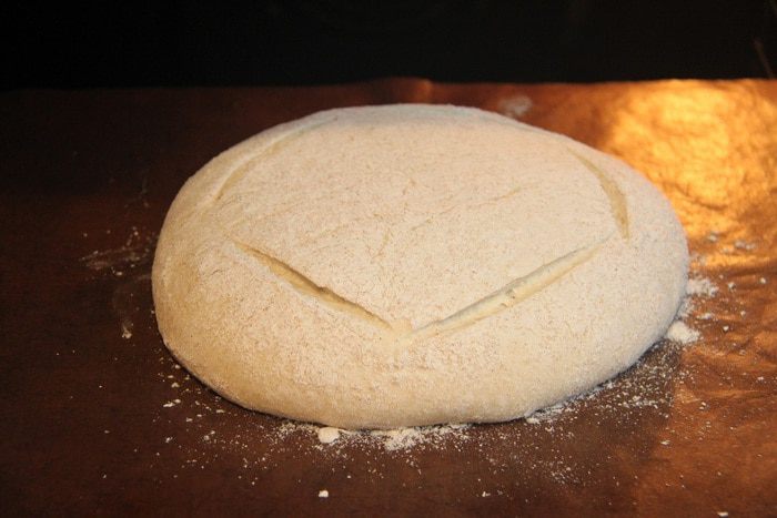 Через час тесто обмять, оставить на расстойку на 1 час. Через указанное время тесто выложить на рабочий стол, придать форму шара, обвалять со всех сторон ц/з мукой. Оставить под полотенцем на 1 час. Духовку разогреть до 250°С вместе с противнем. Хлеб выложить на горячий противень, быстрыми движениями сделать надрезы ножом. Выпекать 10 минут при 250°С с паром, затем 25 — 30 минут при 180°С без пара.