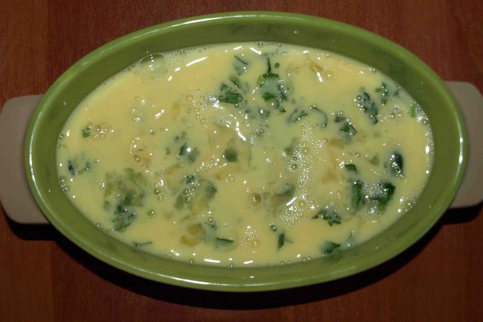 Заливаем яйцами и отправляем в разогретую до 180°С духовку на 20 — 25 минут. Духовку в течение 20 — 25 минут не открывать.