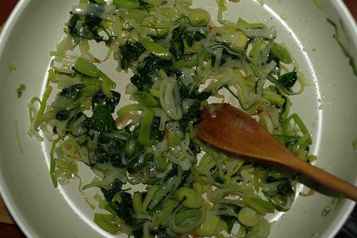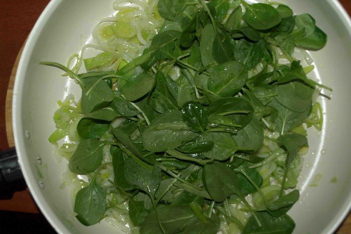 Мини шпинат промыть, дать стечь воде. Добавить к луку порею и потушить 2 — 3 минуты. Добавить соль и перец по вкусу.