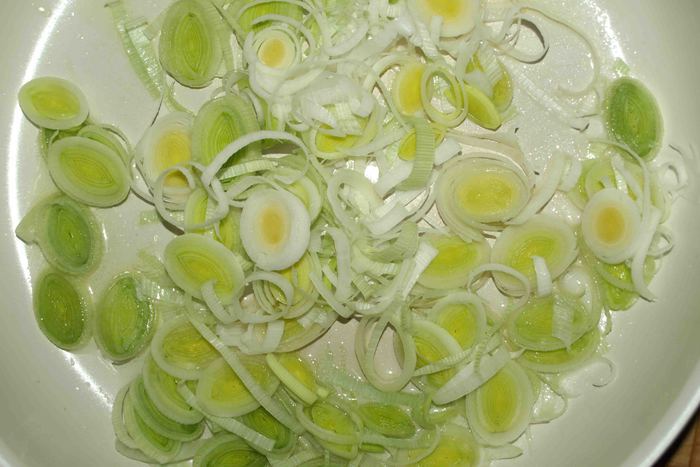 Разогреваем сковороду, добавляем растительное и сливочное масло. Лук порей (белую часть) режем кольцами. Отправляем в сковороду и обжариваем, пока лук не станем мягким.