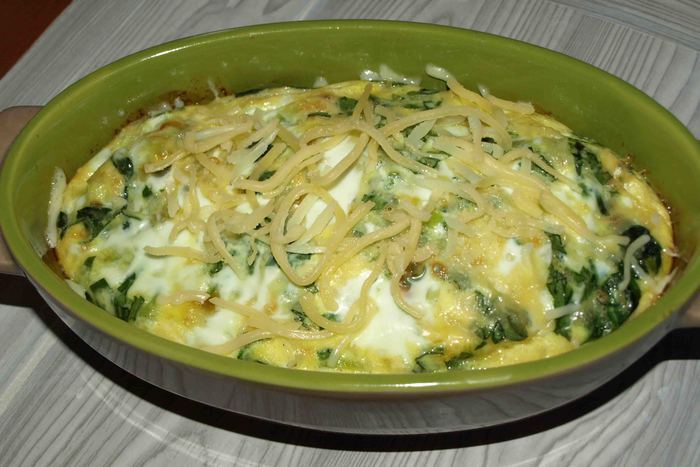 По истечению 20 — 25 минут духовку отключить и оставить омлет в духовке еще на 5 минут. Достаем готовый омлет. По желанию можно посыпать сыром.