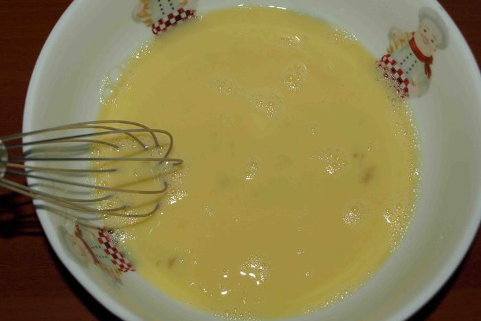 Яйца с молоком взбалтываем, слегка взбивая. Не надо сильно взбивать. Яйца и молоко должны быть комнатной температуры. На одно яйцо одна столовая ложка молока.